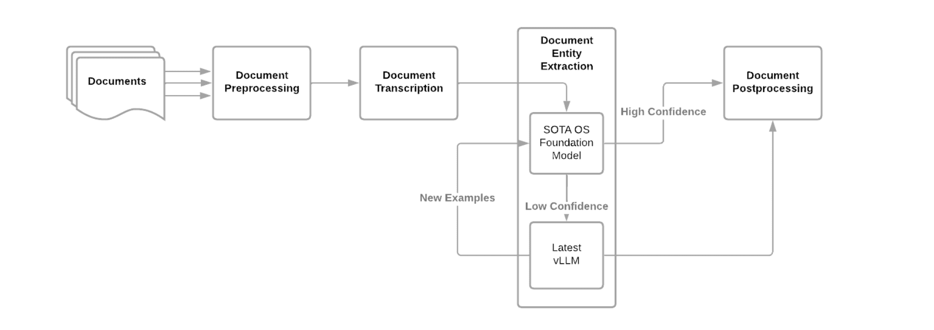 A critical part of the document intelligence pipeline, as mentioned previously, is the ability to leverage the constantly emerging availability of what I would call “very large language models” (vLLM), or commercially available and hosted LLMs that comprise more than 100 billion parameters in order to both provide quality training examples for open source LLM transfer learning, but also such an implementation can mitigate potential low confidence responses from the OS implementation, but routing those to the vLLM for processing. The latest high performing SOTA OS foundation models have less than 10 billion parameters, making it more feasible for hosting and scaling, but require examples drawn from a statistically similar domain in order to perform well. In cases where examples do not currently generalize well to the existing population, the vLLM can be called to fulfill the task. This minimizes reliance on the vLLM but enables taking advantage of its power when needed.