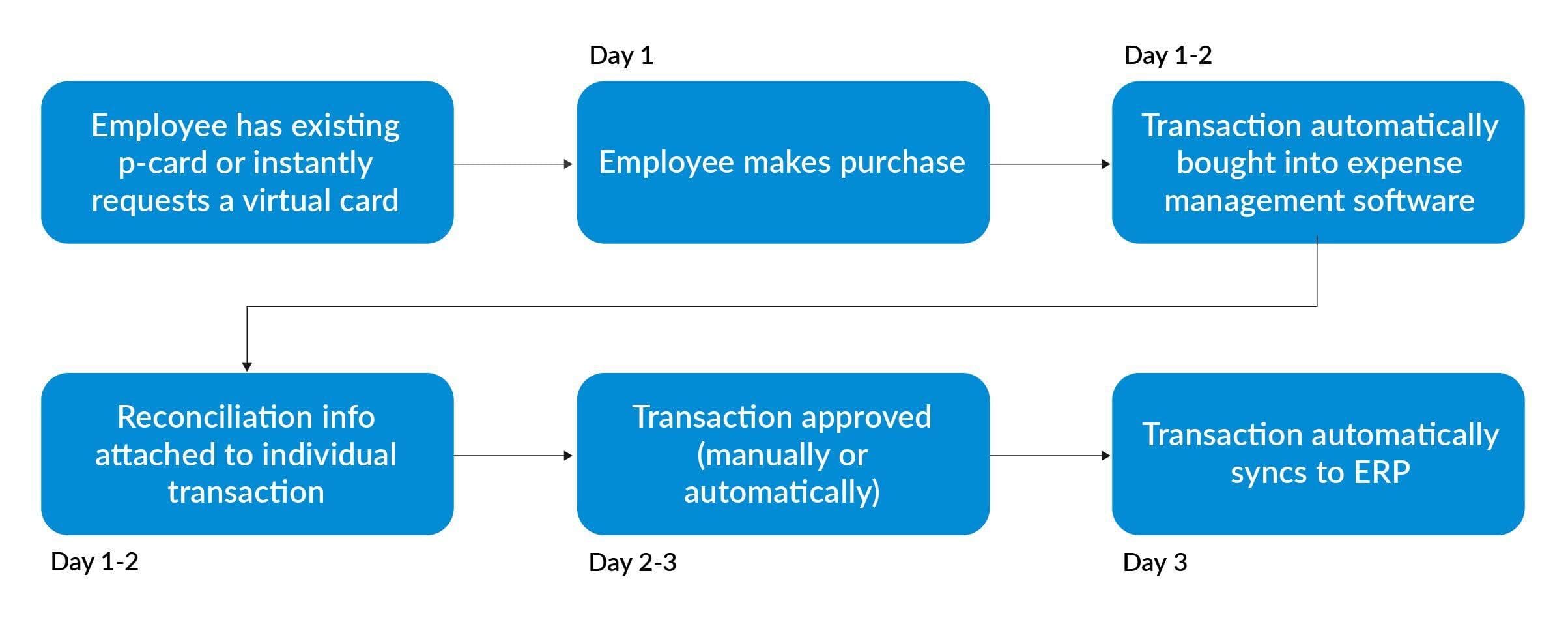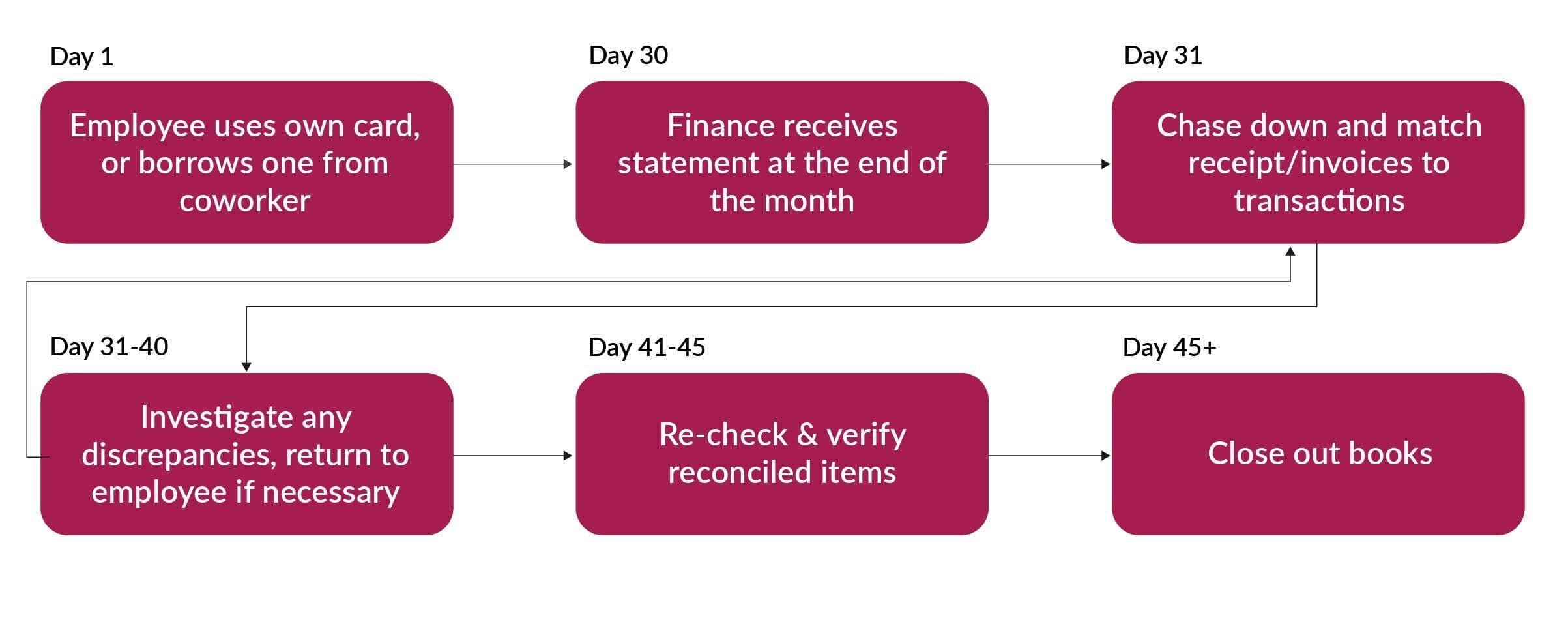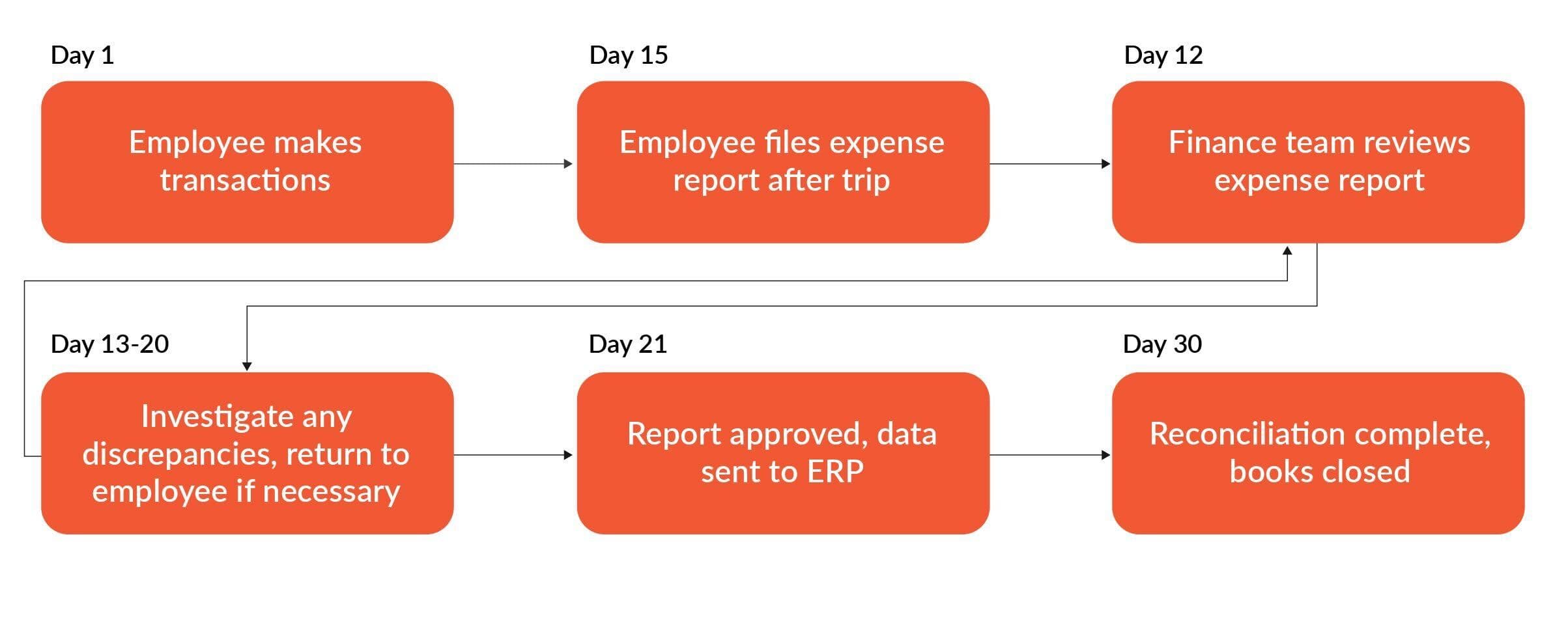 Processing typically requires 30 days from transaction to reconciliation. The timeline depends on employee submission habits and month-end close schedules.