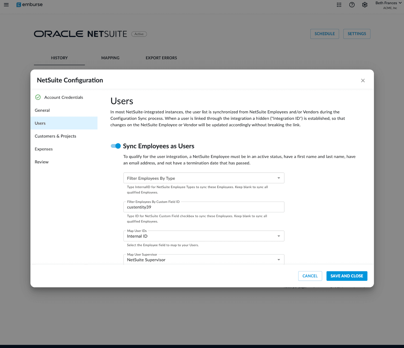 - Self-Service Setup: The connector provides an intuitive setup experience with a guided workflow, empowering administrators to authenticate and configure quickly and efficiently. User management options enable you to import employees, vendors, or both, automating a typically manual step to save administrators time and effort. You can also use filtering to import a subset of your records, ensuring only the necessary data syncs from NetSuite.
