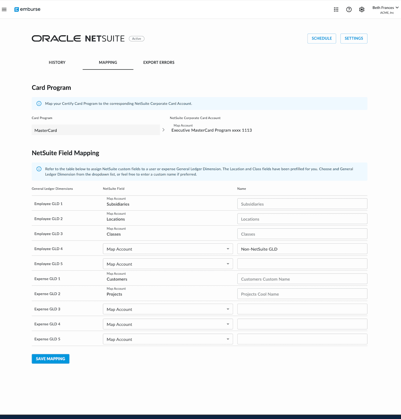 - Flexible Mapping Options: We understand that each organization is unique. With this connector, you have the tools to map card programs in Emburse to a credit card account or vendor in NetSuite to ensure transactions post correctly, as well as map primary fields from NetSuite to general ledger dimensions (GLDs) in Emburse for greater configuration control.