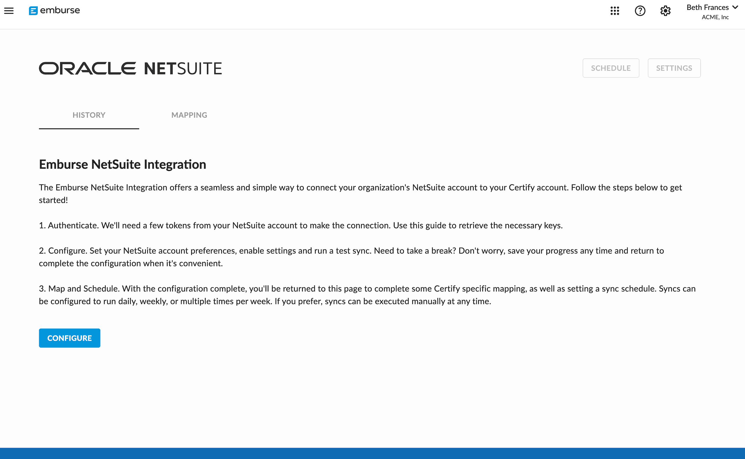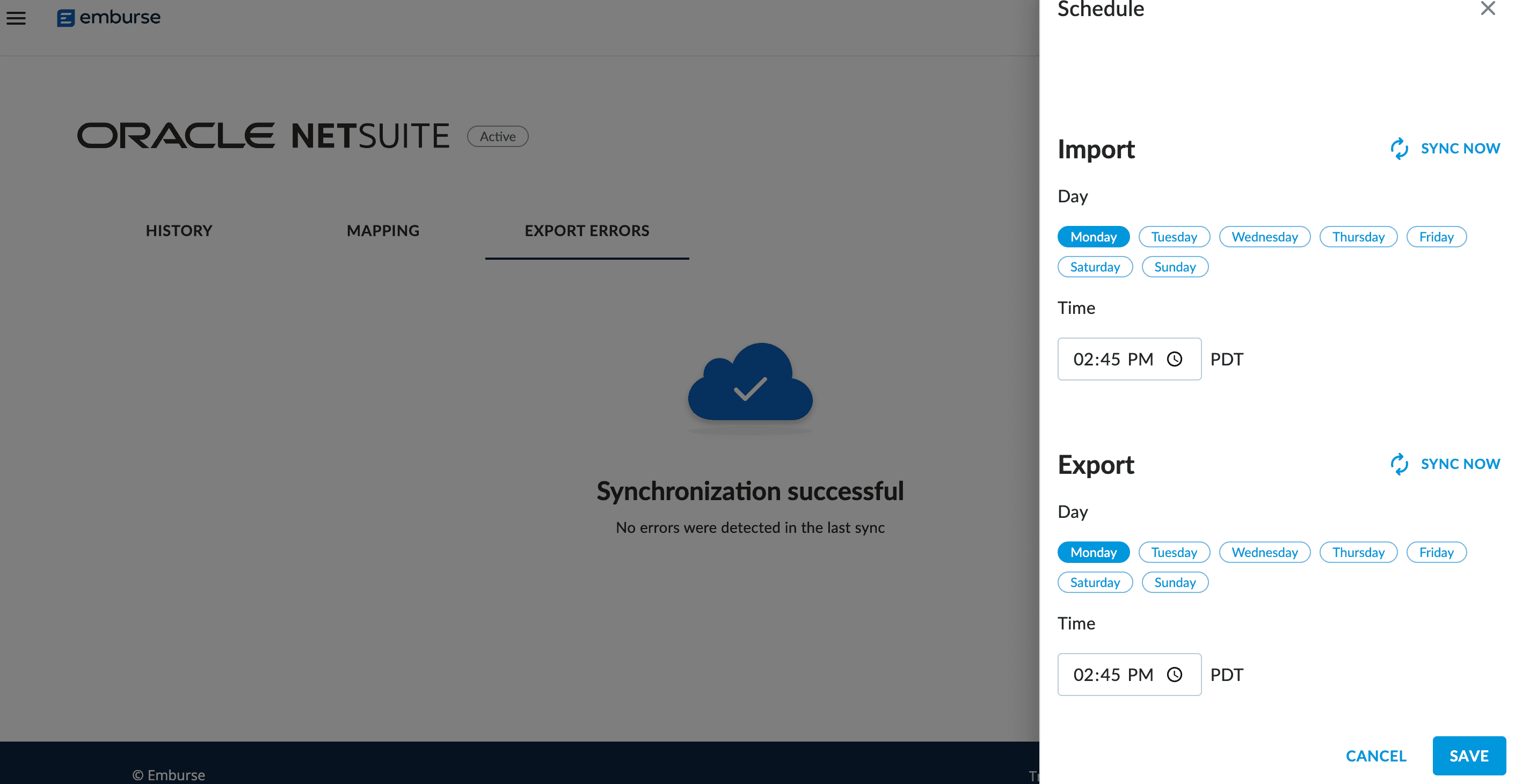 - Direct, Bidirectional Data Syncing: Gone are the days of manually exporting and importing CSV files. The connector automates data flow between Emburse and NetSuite, reducing the time and resources needed to maintain accurate financial records. Plus, you can easily set a custom sync schedule that optimizes the timing to not interfere with syncs between NetSuite and other systems, improving operational efficiency.