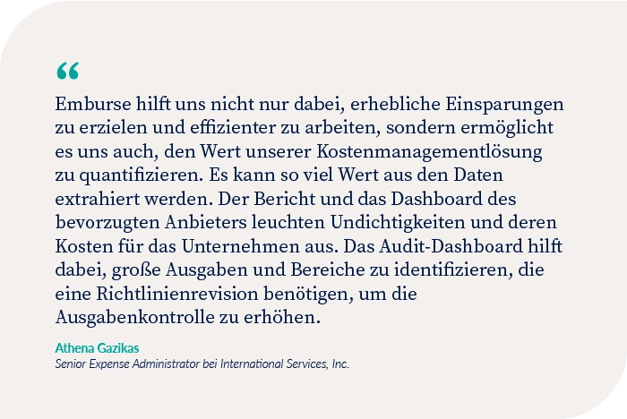 Mit mehr als 700 Außendienstmitarbeitern überwiegte die Höhe der Ausgaben (und die gesamte Abwicklung, die damit verbunden war) schnell die Fähigkeit von International Services, Inc. (ISI), wichtige Kennzahlen zu verarbeiten und Berichte zu erstellen. Selbst mit massiver Zeit, die für die Berichterstattung aufgewendet wurde, griff der Prozess immer noch nicht tief genug – und ISI war nicht in der Lage, den Wert des Spesenmanagements zu quantifizieren.ISI entschied sich zunächst für Emburse Certify, um die Genauigkeit und Pünktlichkeit seiner Ausgabeneinreichungen zu verbessern. Die Finanzen hätten jedoch durch das Volumen und die Tiefe der benutzerdefinierten Berichte verbessert werden können, die von der Organisation benötigt werden. Jede Woche verbrachte Athena Gazikas, Senior Expense Administrator, Stunden damit, Daten aus verschiedenen Quellen zusammenzutragen, um Berichte über den finanziellen Zustand des Unternehmens zu erstellen und strategische Orientierung zu bieten. Der manuelle, Excel-basierte Prozess war mühsam. Oft konnte sie keine genauen Angaben über kritische Kennzahlen wie wöchentliche Ausgaben machen.Gazikas erkannte den Wert der Verwendung von Ausgabendaten zur Optimierung der Ausgaben und Verbesserung der Compliance. Dennoch zog ISI zunächst keine Analyselösung in Betracht, da das Team nur einige spezifische Berichte benötigte. Als es sich entschied, Emburse Analytics hinzuzufügen, begann ISI sofort, Einsparungen in mehreren Bereichen aufzudecken und gleichzeitig seinen Teams zu helfen, die Berichterstattungsprozess.