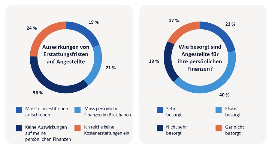 40 % aller Arbeitnehmer berichten von wiederholter Kontoüberziehung, Selbstbehalten, Säumniszahlungen oder Zinsen auf eine persönliche Kredit- oder Debitkarte aufgrund von beruflichen Anschaffungen. Weitere 40 % werden finanziell von den späten Erstattungsfristen ihres Arbeitgebers geschädigt, müssen entweder ihre Finanzen genauer im Auge behalten oder Zahlungen verzögern, weil sie auf die Erstattung warten.