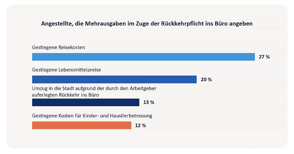 Denn leider hat die Rückkehr ins Büro das Portemonnaie der Arbeitnehmer weiter belastet. So geben 27 % der Arbeitnehmer an, nun höhere Pendlerkosten zu haben, 20 % klagen über höhere Lebensmittelpreise, 12 % führen gestiegene Ausgaben für Kinder- oder Haustierbetreuung an und 13 % mussten (wieder) in die Stadt ziehen, um den RTO-Weisungen des Arbeitgebers zu genügen.