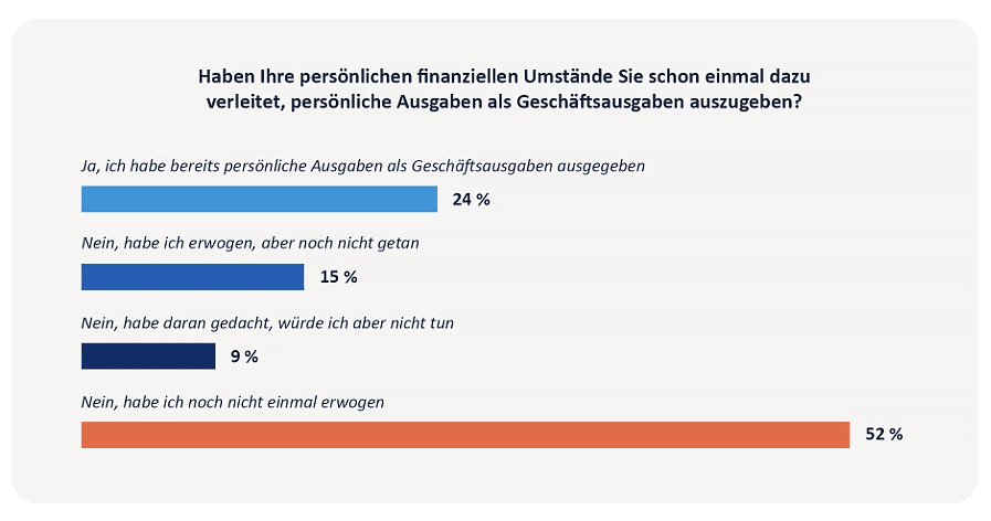 Die Spesenregelungen von Unternehmen erhöhen den finanziellen Druck auf Mitarbeiter noch zusätzlich: So wundert es nicht, dass 24 % aller befragten Arbeitnehmer zugeben, persönliche Ausgaben als Geschäftskosten zu verbuchen. Weitere 15 % haben schon einmal darüber nachgedacht, ihre Spesenabrechnungen zu fälschen, haben es aber noch nicht getan.