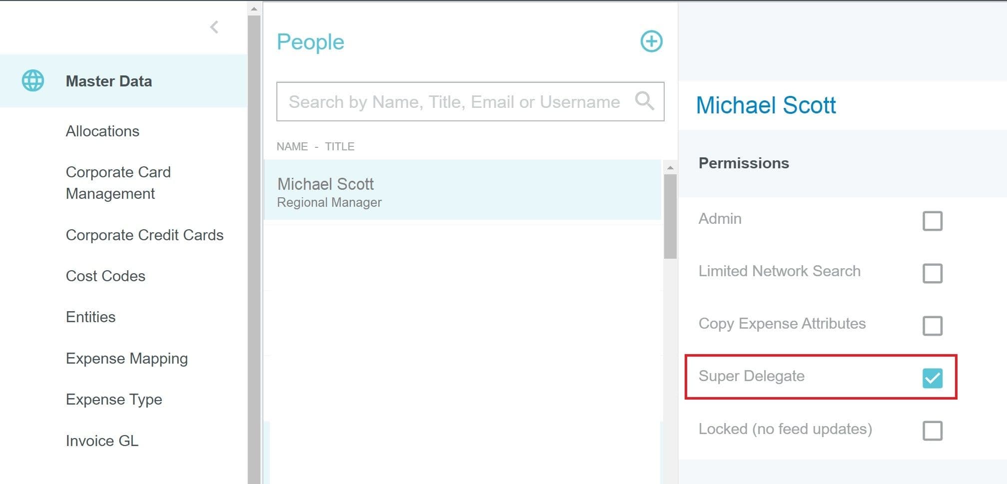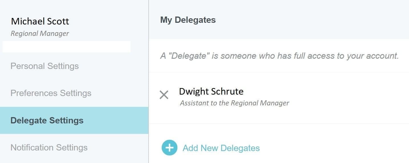 A Super Delegate serves as a delegate for everyone in the company/organization, without each individual user having to specifically grant delegation access. If company-wide access is not appropriate, the Super Delegate role can be configured to be restricted based on a particular profile attribute. Rather than see a list of names underneath their name, the Super Delegate is presented with a searchable selection list to find the employee they wish to delegate to.