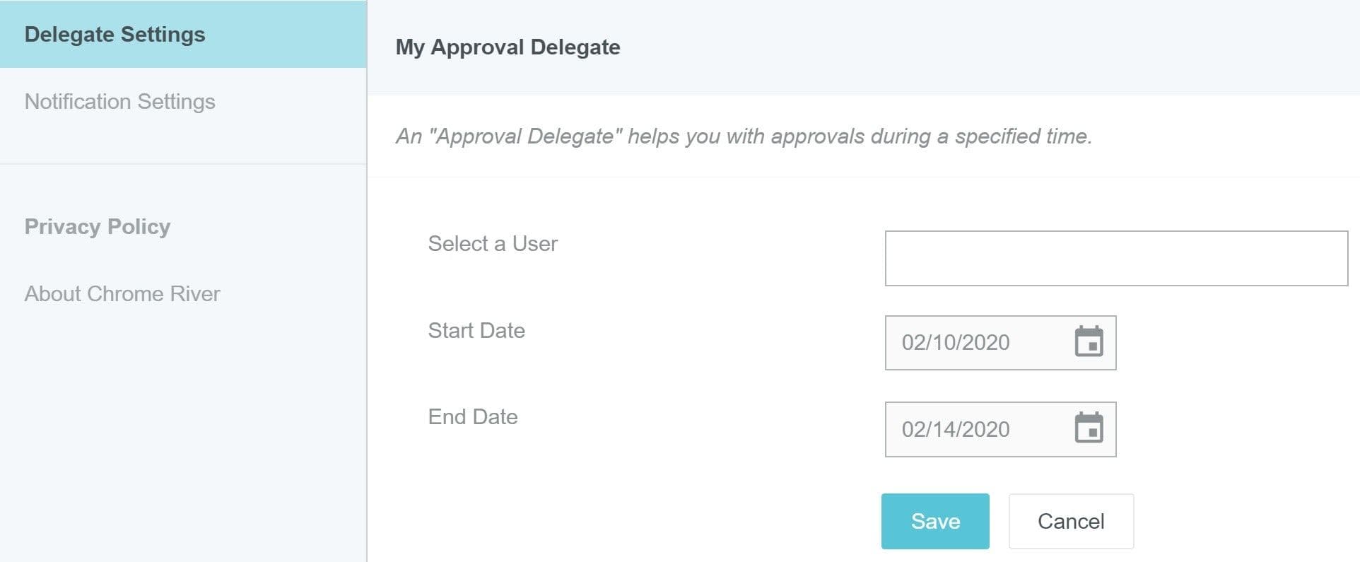 An approval delegate is someone a user can assign to approve expense reports on their behalf. This delegation is a temporary assignment which allows the user to approve expenses and pre-approvals while the user is on vacation. Approval delegates will receive the approvals directly to their approval dashboard.