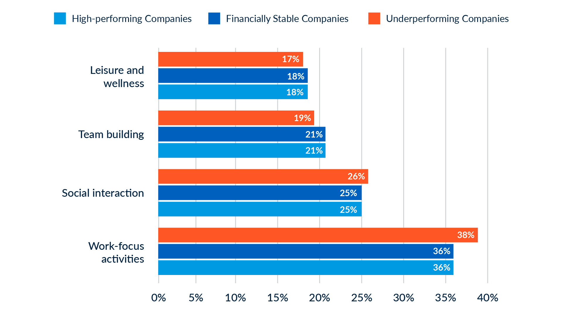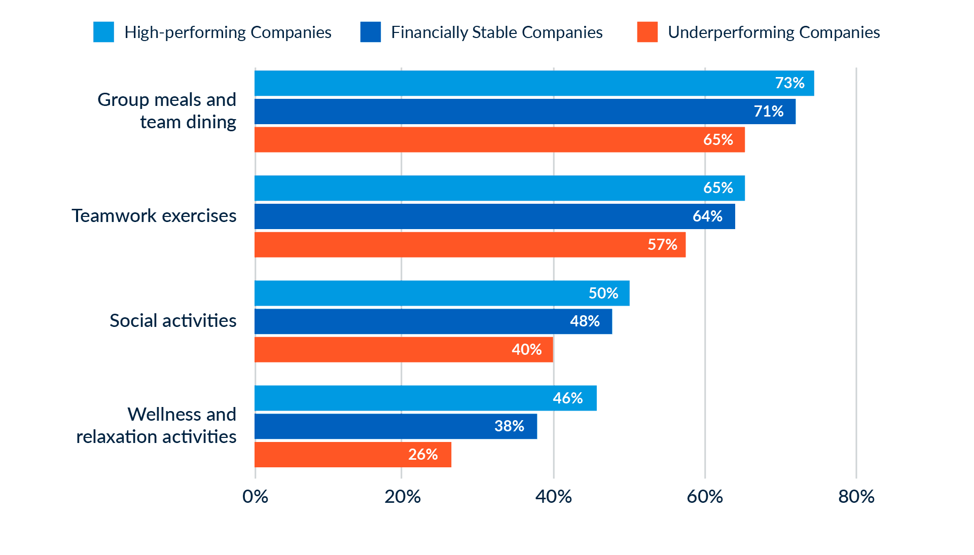 Desde cenas de equipo (73%) hasta actividades de bienestar (46%), las empresas de alto rendimiento mantienen tasas de participación más fuertes en comparación con sus contrapartes de bajo rendimiento, quienes muestran un compromiso mucho menor, particularmente en bienestar (26%) y actividades sociales (40%).