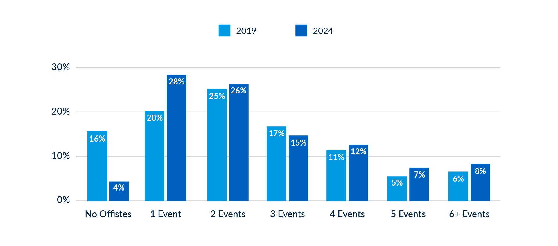 Las reuniones corporativas fuera de la oficina han mostrado un crecimiento constante desde 2019, con un aumento en el promedio anual de eventos de 2.4 a 2.6 en 2024. El número de empresas que no realizan estas reuniones ha disminuido del 16% al 4%, lo que indica un cambio claro hacia la normalización de estos eventos.