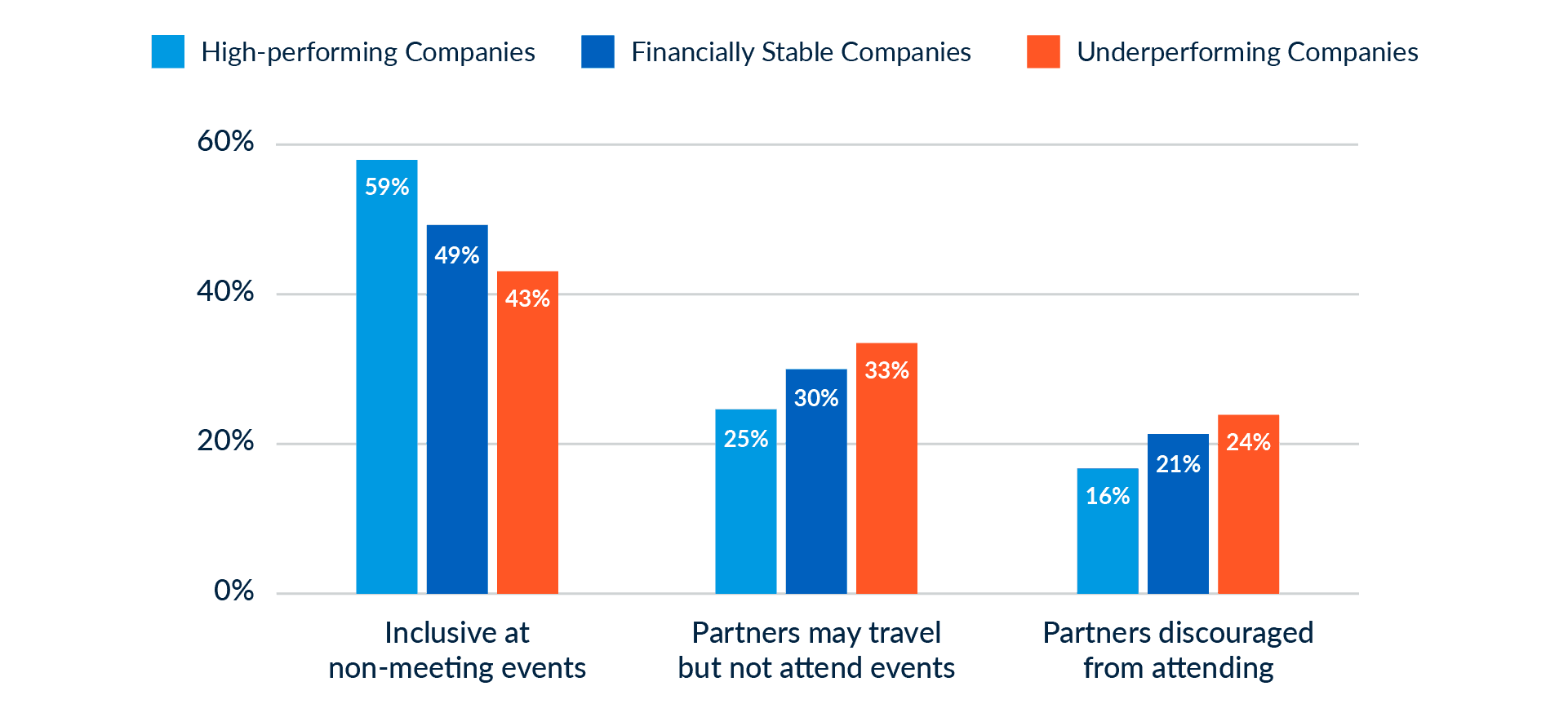 Las empresas reconocen claramente el beneficio de permitir que los empleados aprovechen al máximo su tiempo fuera de casa. En comparación con las empresas de bajo rendimiento, las organizaciones de alto rendimiento tienen un 15% más de probabilidades de ofrecer viajes de bleisure y un 16% más de probabilidades de incluir a los compañeros en eventos que no sean reuniones. Las empresas de bajo rendimiento muestran políticas más restrictivas en general, con casi una cuarta parte (24%) desalentando activamente la participación de los compañeros en comparación con el 16% en las organizaciones de alto rendimiento.