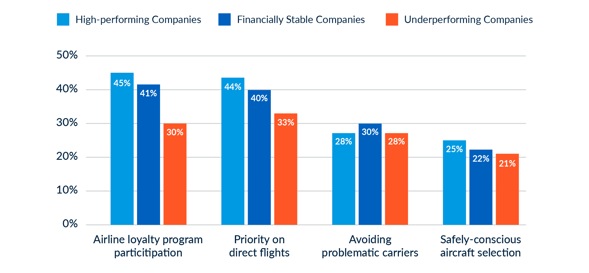 Las preocupaciones sobre la seguridad muestran una mayor uniformidad entre las organizaciones. Todos los tipos de empresas muestran preferencias similares en cuanto a evitar aerolíneas donde sus empleados han tenido problemas anteriormente (28%-30%) y en relación con la seguridad de las aeronaves (21%-25%), lo que sugiere que estas son consideraciones estándar de la industria más que factores diferenciadores. Aunque las consideraciones básicas de seguridad son universales, las empresas de alto rendimiento se distinguen invirtiendo en la experiencia y la eficiencia de los empleados.