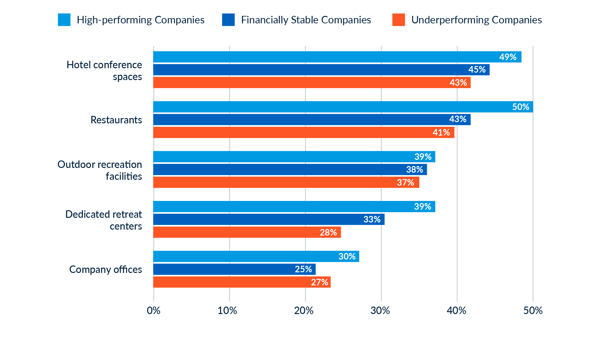 Los datos revelan una conexión sorprendente entre los lugares donde las empresas realizan reuniones externas y el grado de conexión entre los empleados. En comparación con las empresas de bajo rendimiento, las de alto rendimiento tienden a preferir lugares que fomentan la interacción natural: el 50% elige restaurantes (frente al 41%) y el 39% utiliza centros de retiro e instalaciones de recreación al aire libre (frente al 28% y 37%, respectivamente).