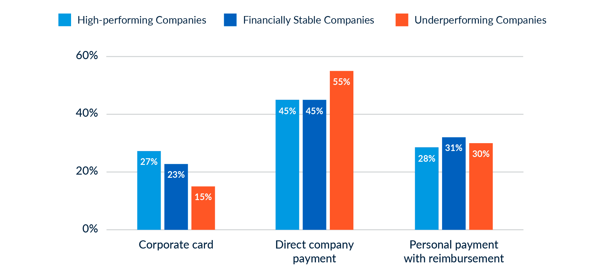 Las empresas de alto rendimiento tienden a confiar más a menudo en las tarjetas corporativas para sus empleados (27%), mientras que las empresas con bajo rendimiento prefieren manejar todos los pagos directamente (55%). Esto podría sugerir diferentes enfoques en la gestión de viajes y gastos: las compañías de alto rendimiento parecen más cómodas otorgando autonomía de gastos a los empleados, mientras que otras desean más control al pagar todo por adelantado para los empleados. Curiosamente, la carga de pagar de su bolsillo y ser reembolsado se mantiene relativamente constante en todos los tipos de empresas, afectando aproximadamente al 30% de los empleados.