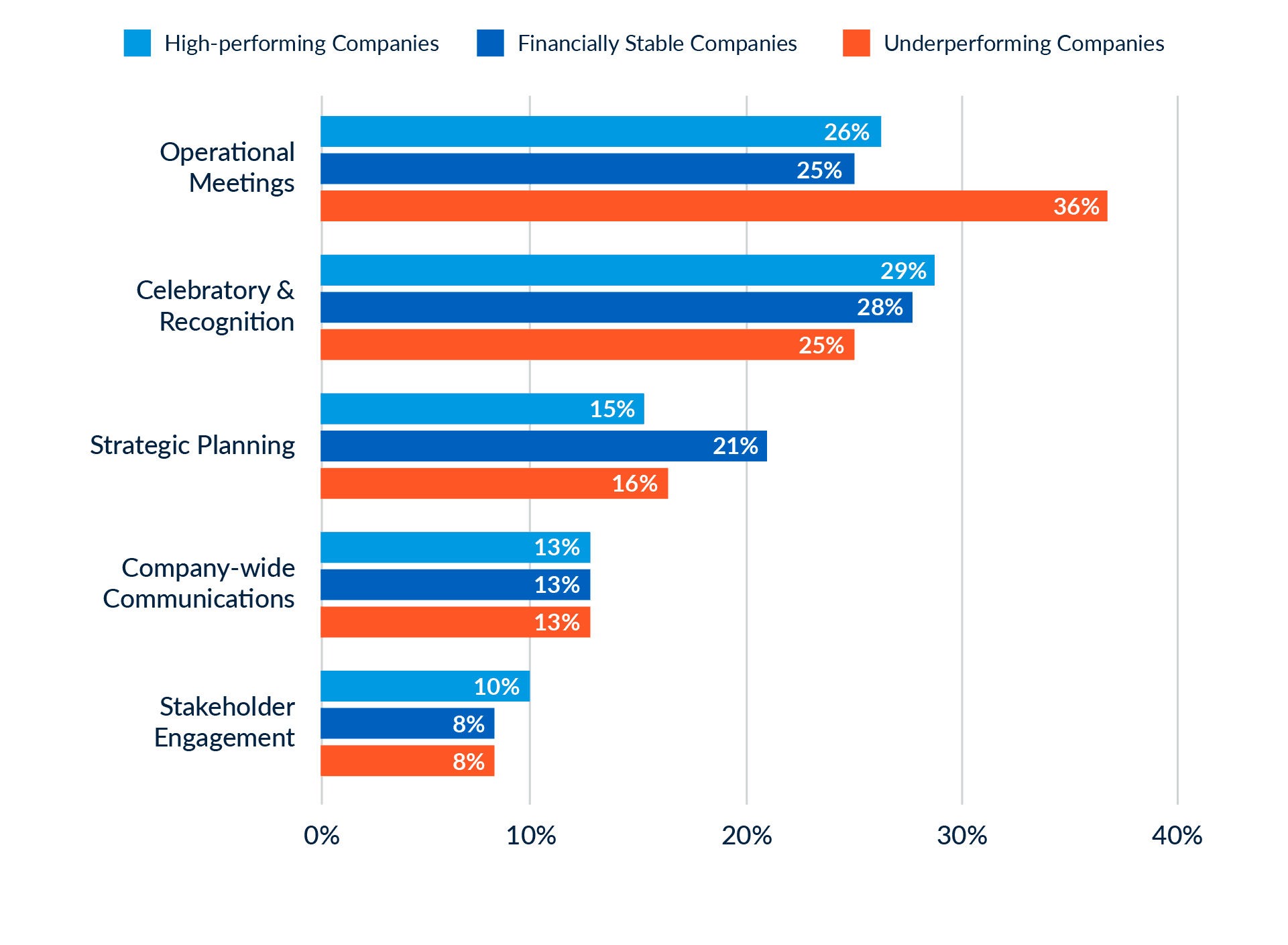 Las empresas con bajo rendimiento muestran un mayor énfasis en las reuniones operativas (de liderazgo, proyectos y departamentales), sumando el 36% del tiempo. Mientras tanto, las empresas de alto rendimiento tienen un enfoque más equilibrado que incorpora eventos celebratorios (29%), planificación estratégica (15%) y reuniones operativas (26%).