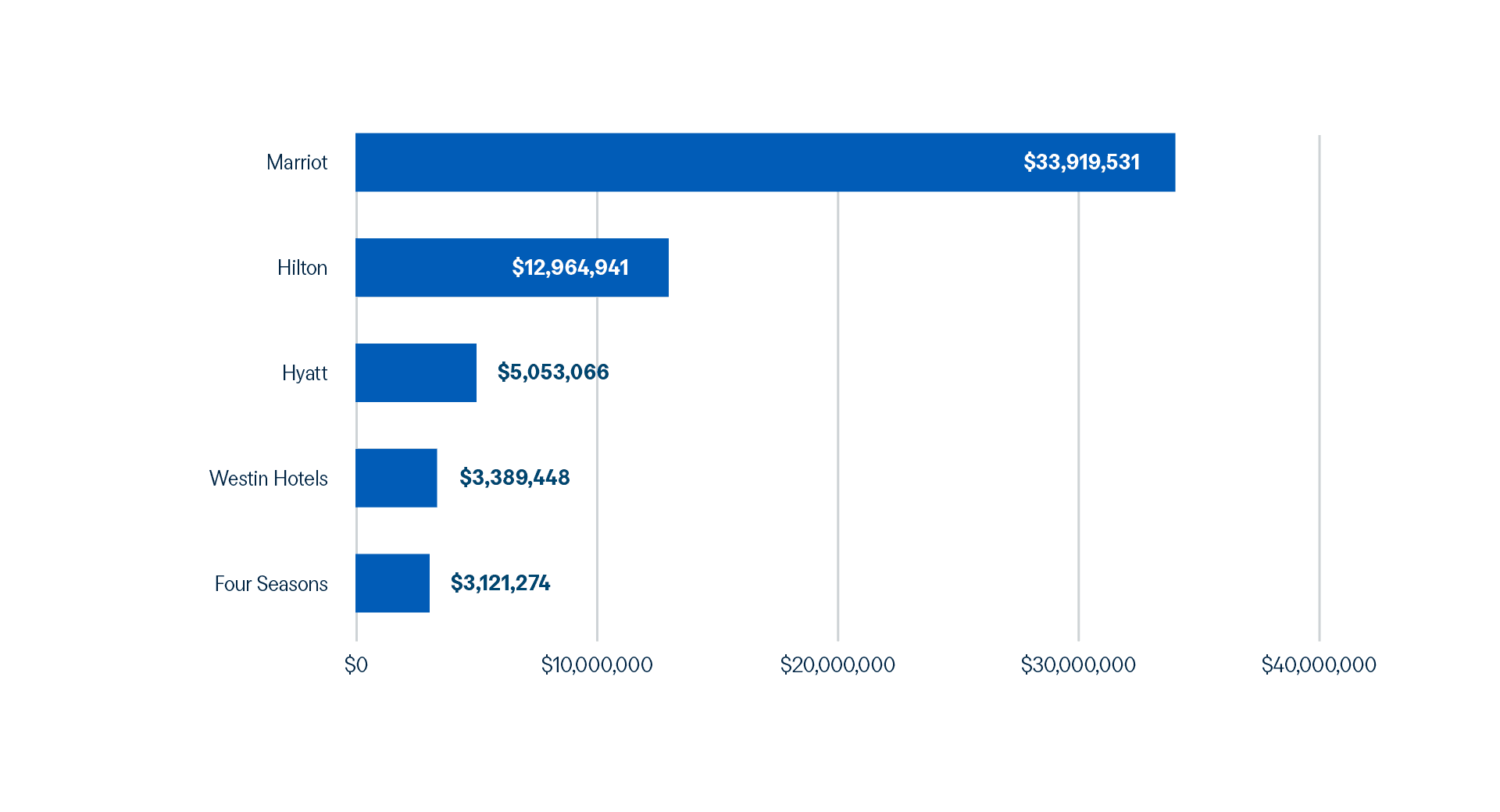 Much of that spend appears in hotel folios or is bundled with room charges and other incidentals. Marriott accounts for ~$33M in dining alone, with Hilton (~$13M), Hyatt (~$5M), Westin (~$3.4M), and Four Seasons (~$3.1M) also near the top of the list.