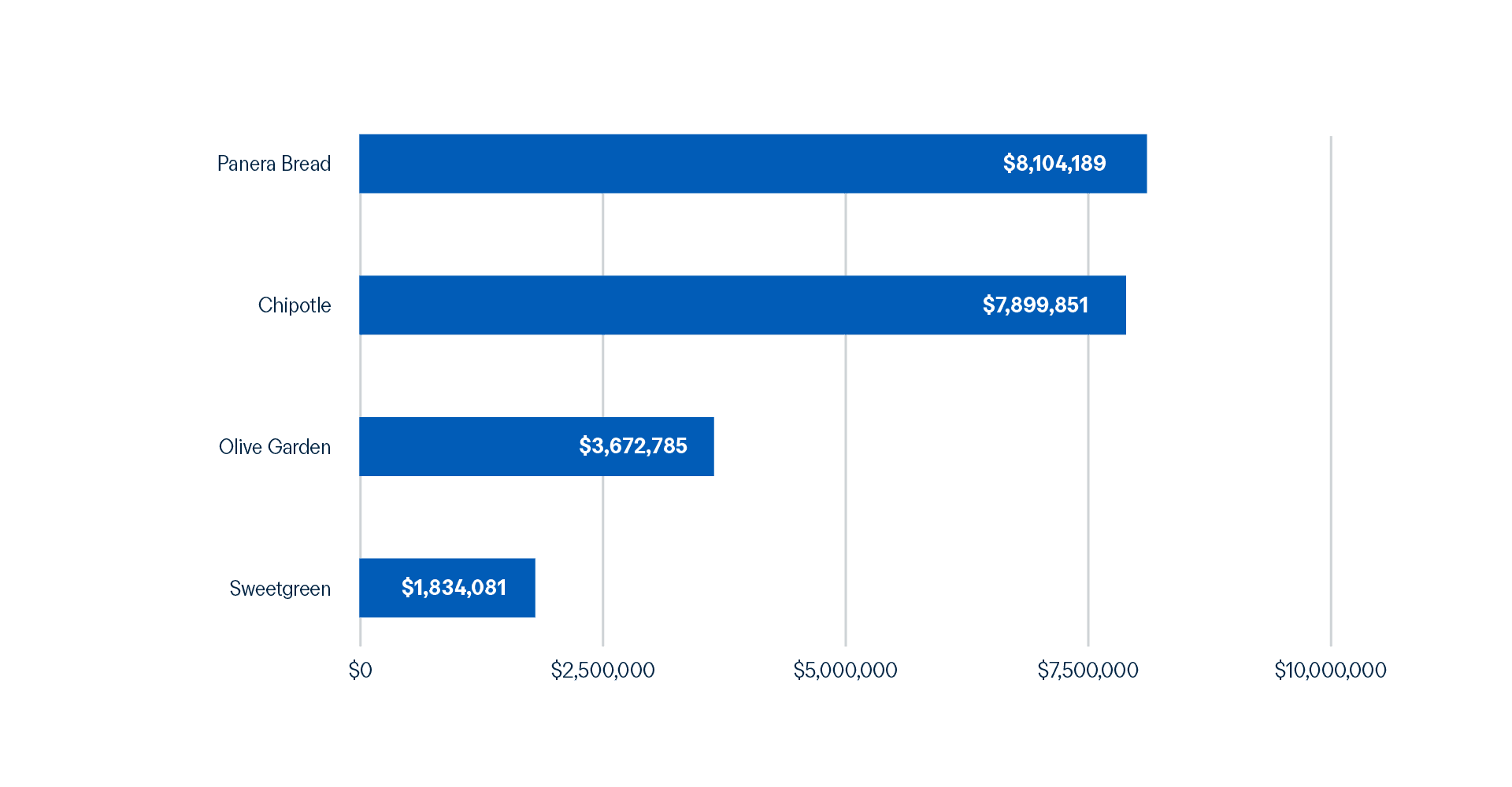 Fast casual occupies the “everyday but elevated” middle ground. Spend in this category often reflects team lunches, office meetings, and hybrid work patterns, especially in urban centers where these brands are densely concentrated. Leading brands include Panera Bread (~$8.1M), Chipotle (~$7.9M), Olive Garden (~$3.7M), and Sweetgreen (~$1.8M).