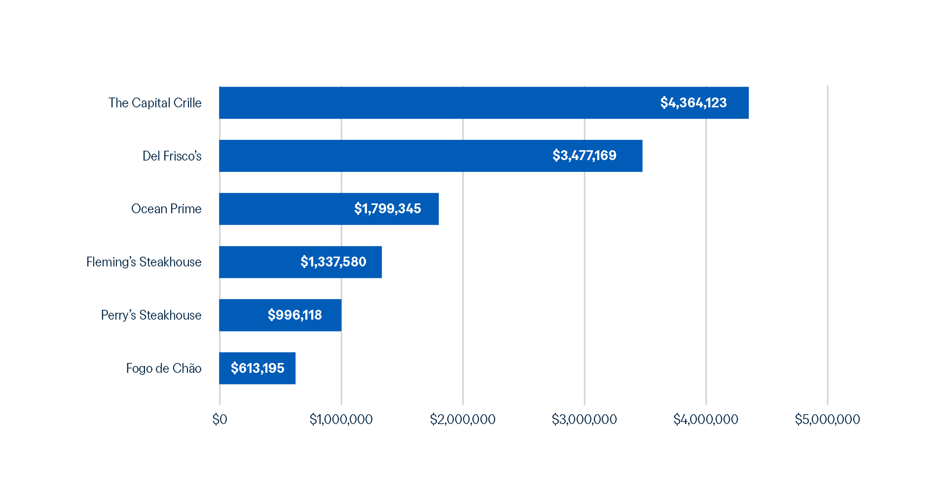 Across upscale steakhouses, fine-dining concepts, and corporate-favorite premium chains, employees expensed $27.1M in high-end meals this year—on just 66K transactions. The Capital Grille leads with roughly $4.4M, followed by Del Frisco’s (~$3.5M) and Ocean Prime (~$1.8M). Fleming’s Steakhouse, Perry’s Steakhouse, and Fogo de Chão follow closely behind.