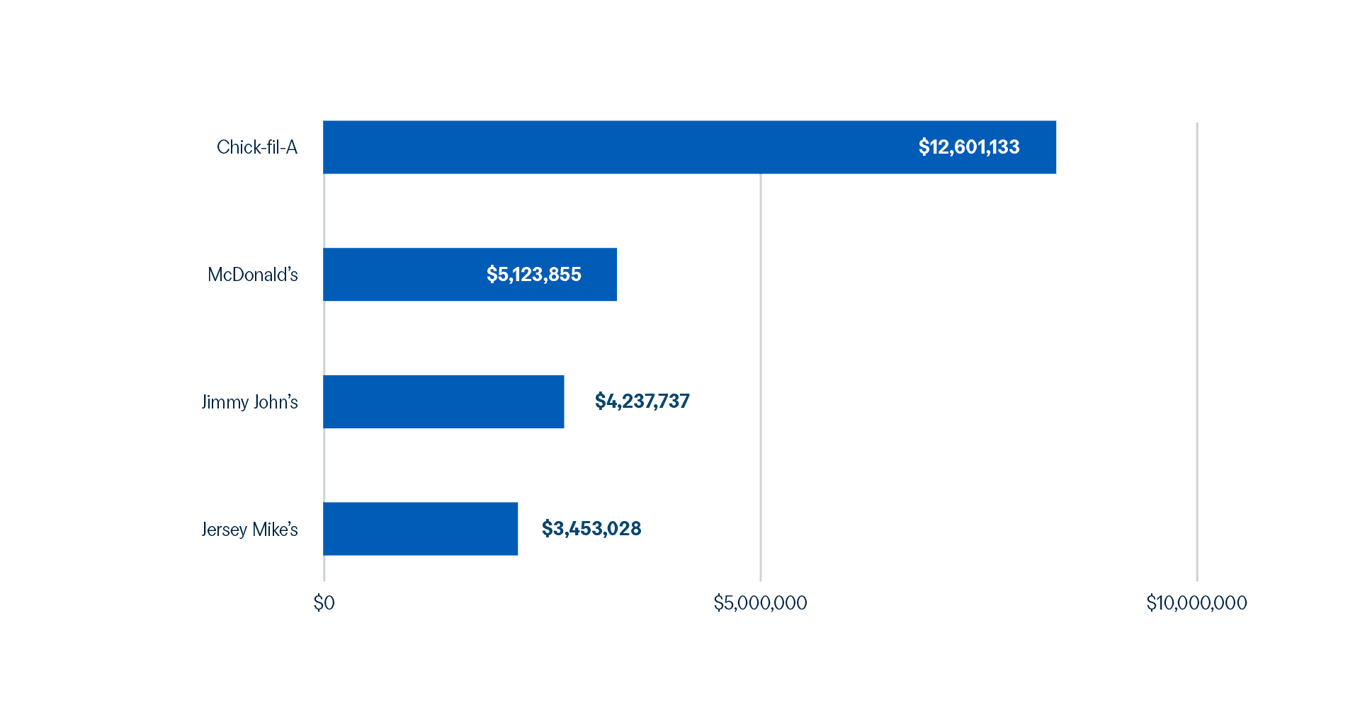 Fast food continues to account for the highest meal volume in the dataset, particularly among field teams and travelers who prioritize speed, consistency, and availability. A small group of national chains captures a large share of this activity, led by Chick-fil-A (~$12.6M), McDonald’s (~$5.1M), Jimmy John’s (~$4.2M), and Jersey Mike’s (~$3.5M).