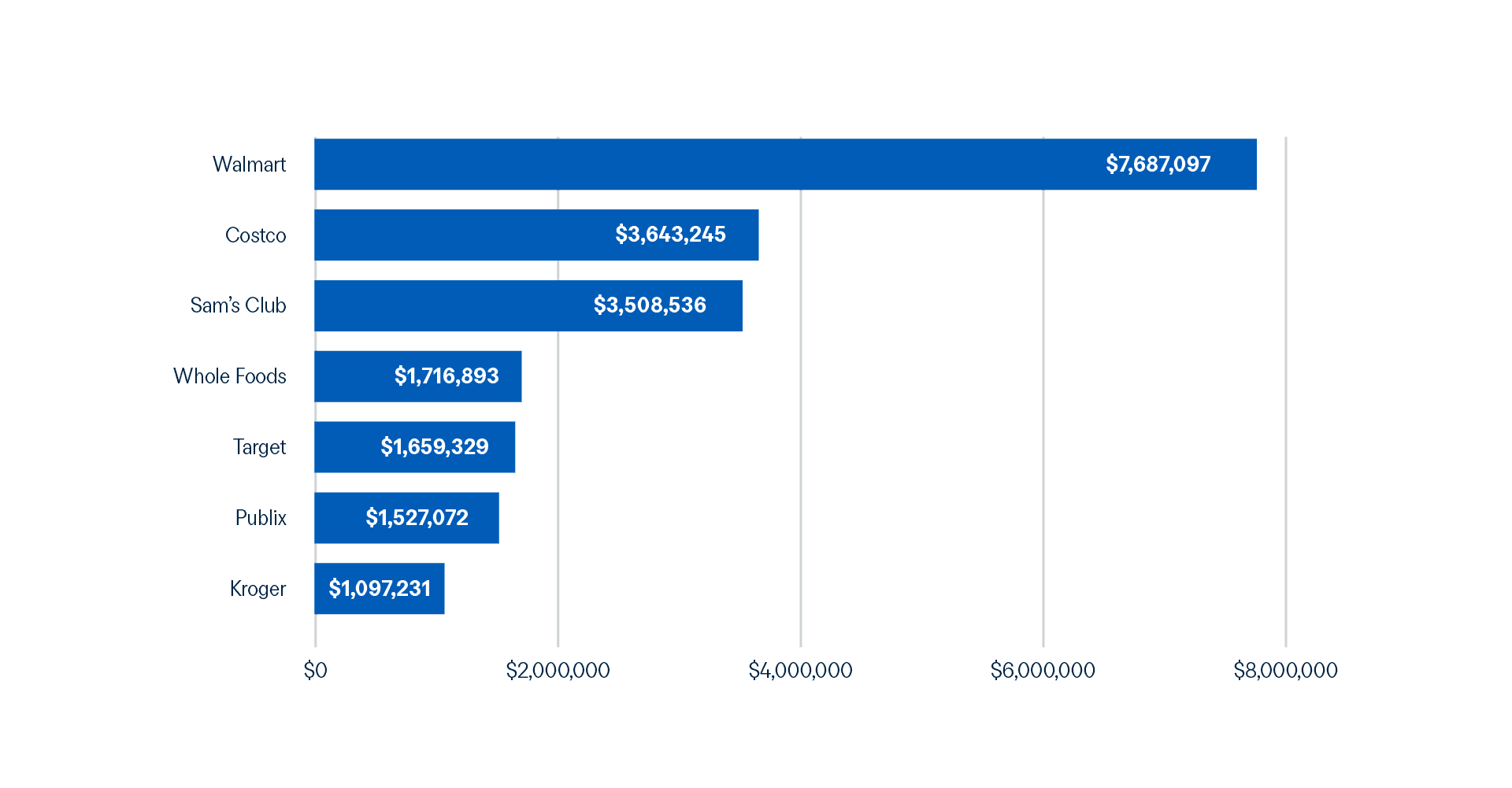 Gas and roadside vendors represent the smallest spend category and appear most frequently in transit transactions. Meals purchased here tend to be inexpensive, informal, and consumed on the move, reflecting the needs of technicians, drivers, sales representatives, and field service teams. Spend concentrates among national fuel and convenience brands, including ExxonMobil, Shell, Wawa, Love’s, Speedway, Circle K, and Chevron.