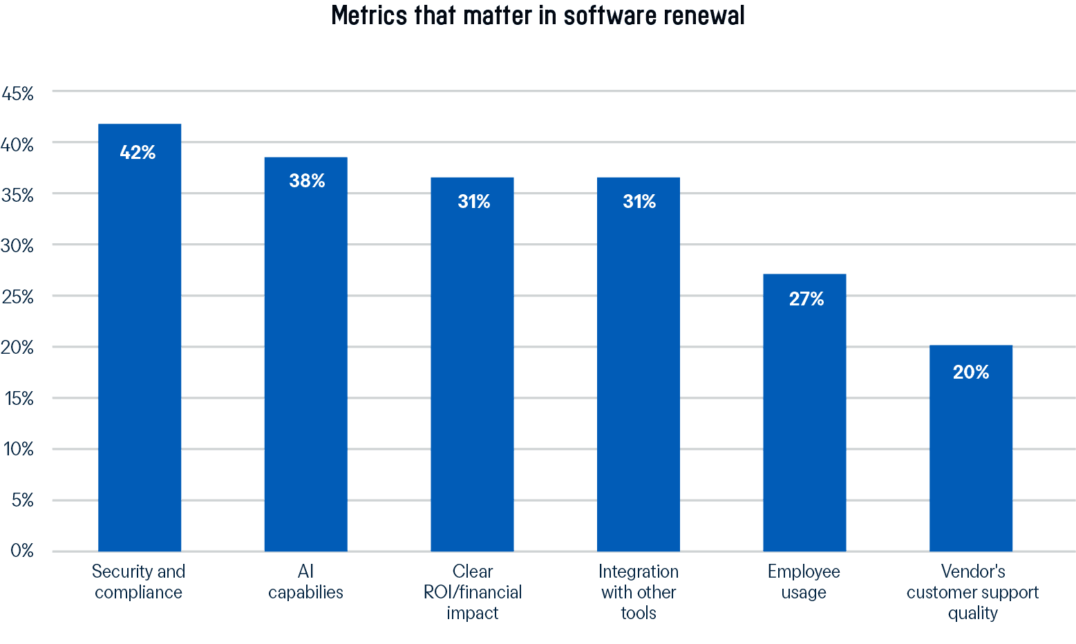 For renewal decisions, leaders prioritize security and compliance (42%), followed by AI capabilities (38%), clear ROI (31%), and integration with existing tools (31%).