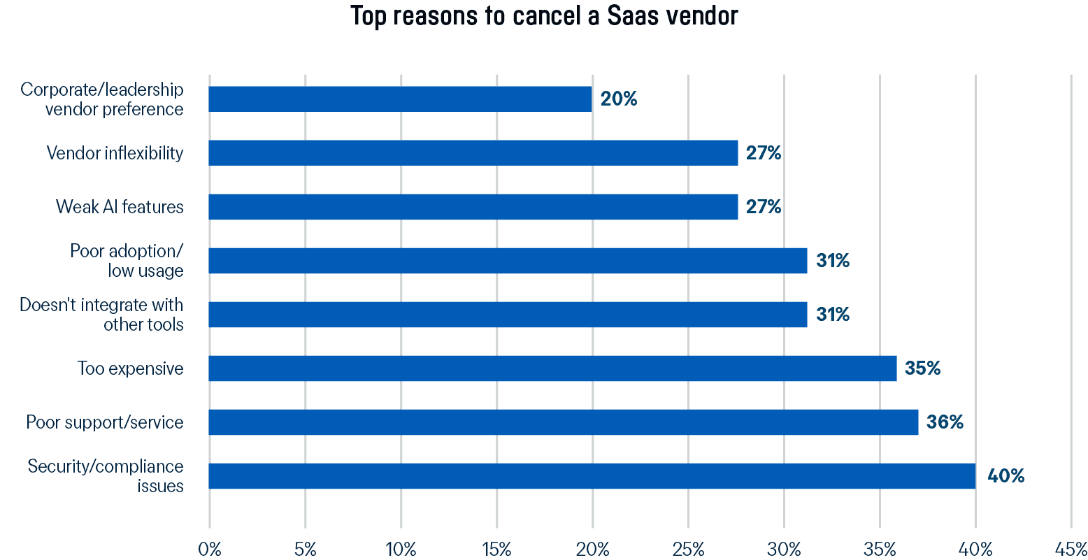 Cancellation data mirrors these patterns: security or compliance gaps (40%), poor integration (31%), weak AI features (27%), and low usage (31%) are the most common reasons vendors are replaced.