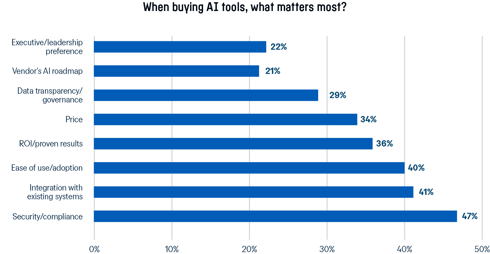 The same priorities shape new AI purchases. Security and compliance (47%) again top the list, followed closely by integration (41%) and ease of adoption (40%).