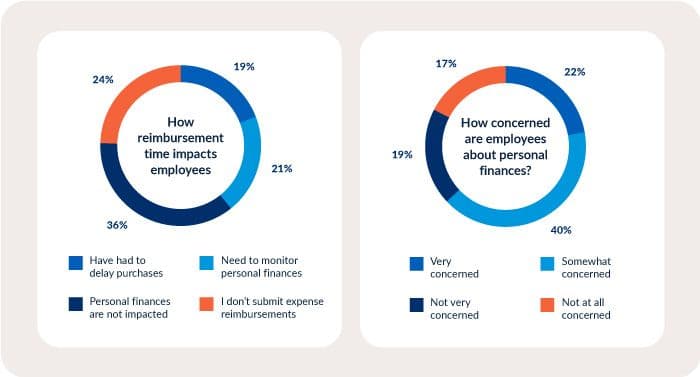 40% of employees reported incurring overdraft, excess, late payment fees or interest on a personal credit or debit card because of a business purchase. Additionally, 40% have been financially affected by their employer’s reimbursement times, either having to keep a closer eye on their finances or delay payments because they’re waiting for reimbursement.