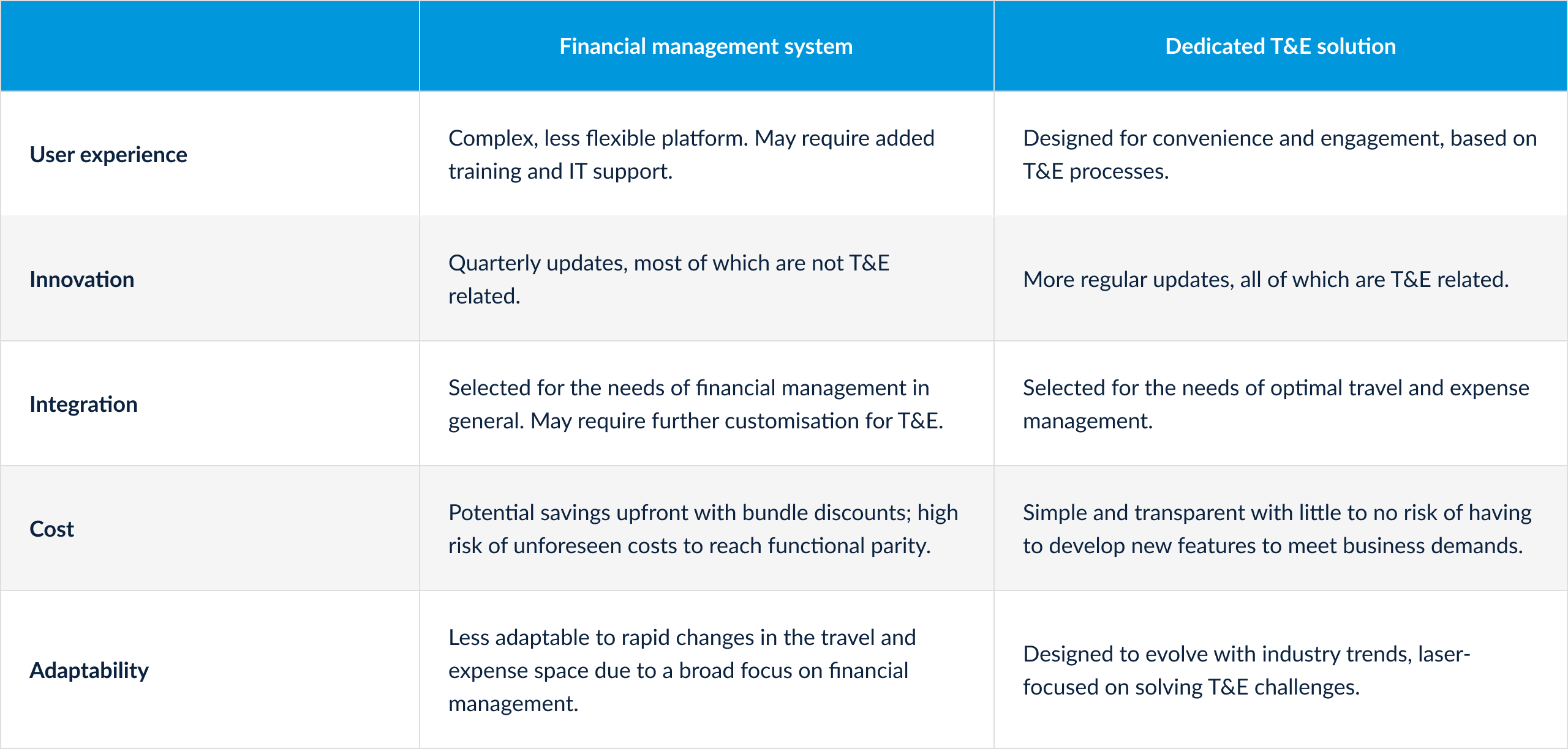 Building an agile travel and expense (T&E) program? Find out how a dedicated T&E solution compares to legacy financial management systems (FMS).