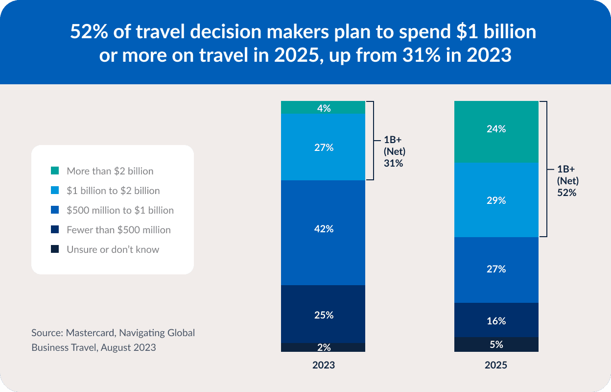 A recent Mastercard white paper confirmed this, revealing that 52% of survey respondents intend to spend at least $1 billion on travel alone in 2025. Further, cutting back on travel looks to not be an option as 43% of survey respondents believe that doing so will result in a 10% decrease in revenue and a 10% increase in employee turnover.